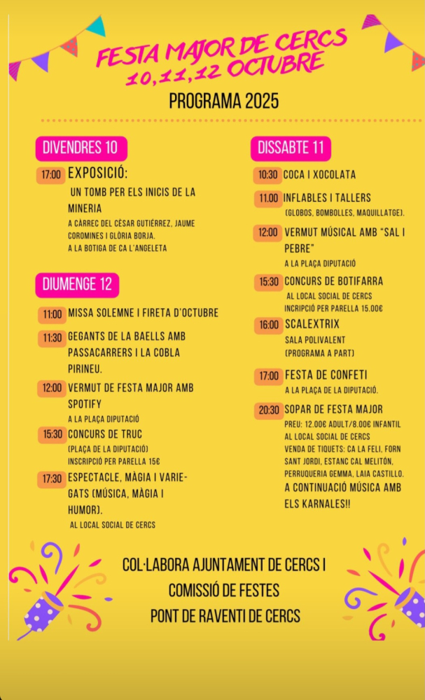 Cercs celebra aquest cap de setmana la Festa Major amb un programa ple d’activitats per a tots els públics. Divendres a les 17:00 h s’inicia amb l’exposició “Un tomb per els inicis de la mineria”, a càrrec de Cèsar Gutiérrez, Jaume Coromines i Glòria Borja, a la Botiga de Ca l’Angeleta.