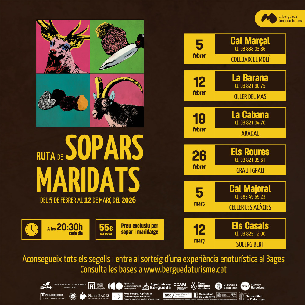 La campanya d’aquest 2026 també inclou sopars maridats durant els mesos de febrer i març, que es faran en mitja dotzena de restaurants i aniran acompanyats de vins de la DO Pla de Bages. Les dates i els establiments concrets es donaran a conèixer properament.
