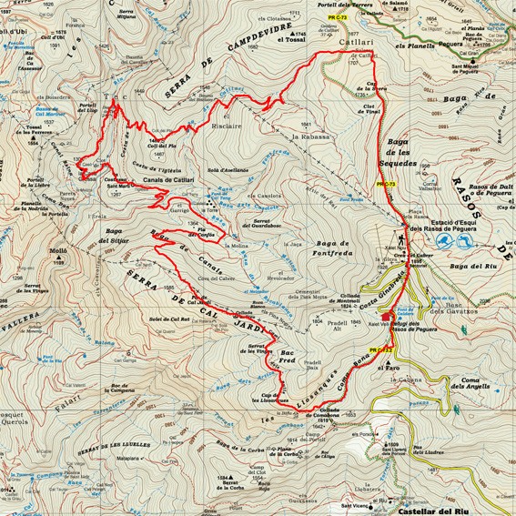 Senyalització: Blanc i Groc PRC-73 i Groc xarxa de senders del BerguedàMarques blanques i grogues (PR-C 73) del Refugi dels Rasos de Peguera fins el cap de la Serra; marques gorgues (Xarxa de Senders del Berguedà) fins la collada de Comabona; marques blanques i grogues (PR-C 73) fins al Refugi dels Rasos de Peguera.