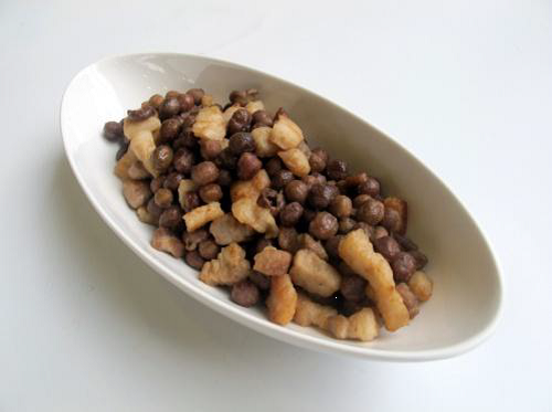 3. Traieu la pell, talleu a daus la cansalada i fregiu-la fins que deixi tot el suc, amb cura, de manera que no us esquitxi massa ni es cremi.