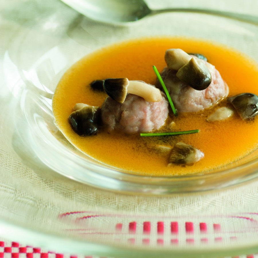 Per fer les bombes, salpebreu la carn picada de porc i prepareu uns daus de formatge. Formeu pilotes petites, deixant el formatge a l’interior. Afegiu les bombes a la sopa uns deu minuts abans de servir-la.