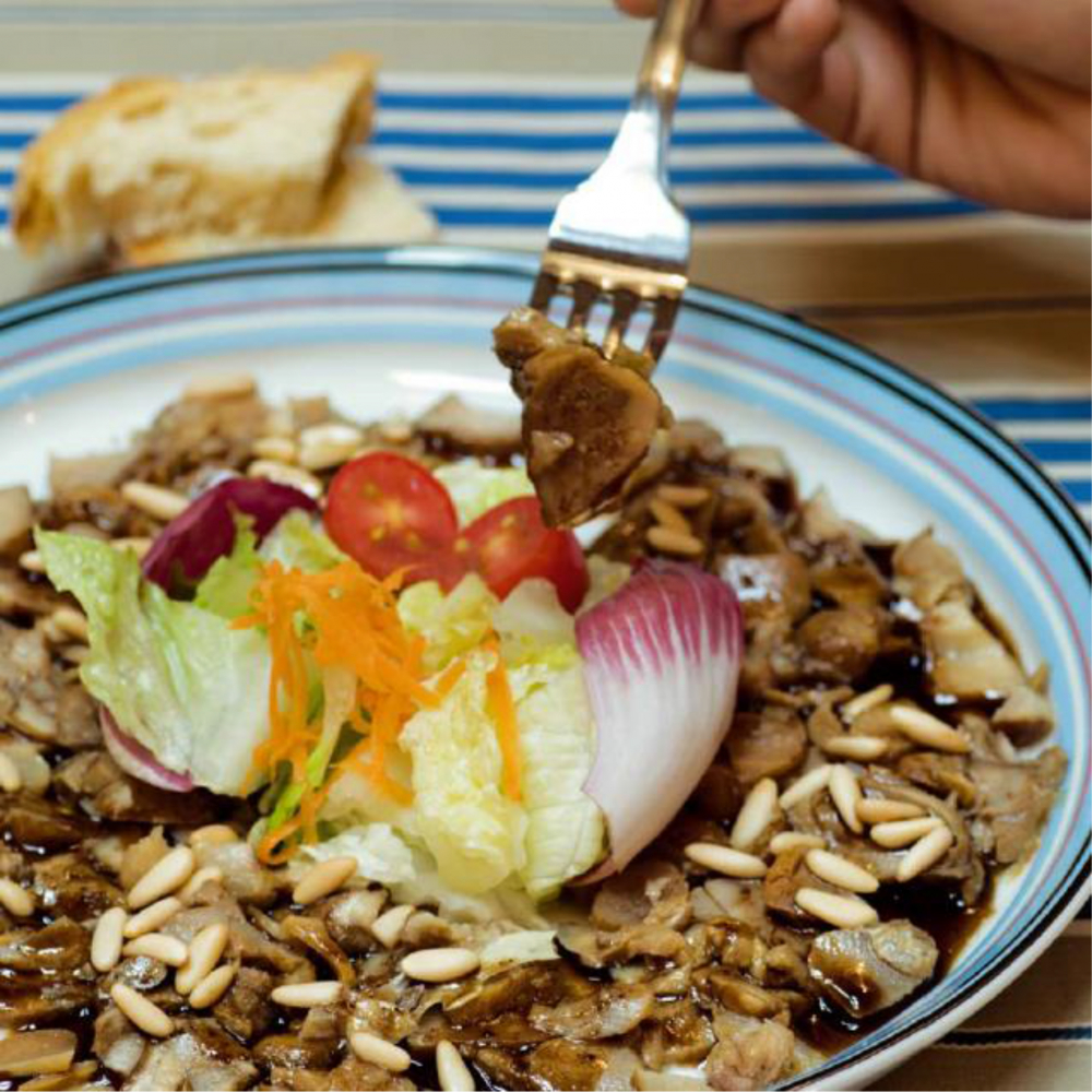 Poseu els talls ben prims al plat, la vinagreta de pinyons, uns quants pinyons i, al mig, un buquet d’enciams.