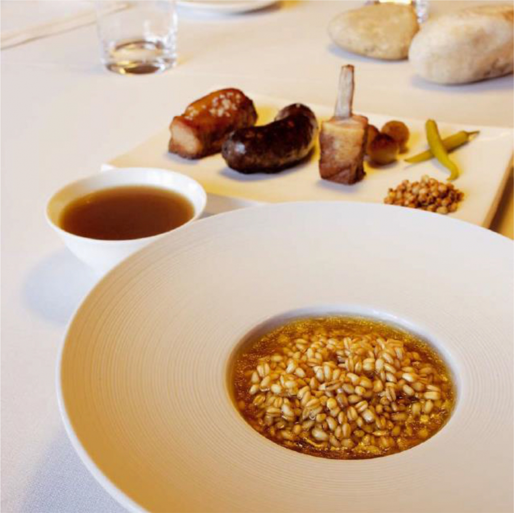 Emplateu el blat escairat amb el seu caldo en plats sopers. El blat excedent torneu-lo a bullir, per després fregir-lo amb l’oli d’oliva i posar-lo en un petit bol de guarnició. També a part, a «banda» emplateu tots els elements del porc, per acompanyar el blat escairat.