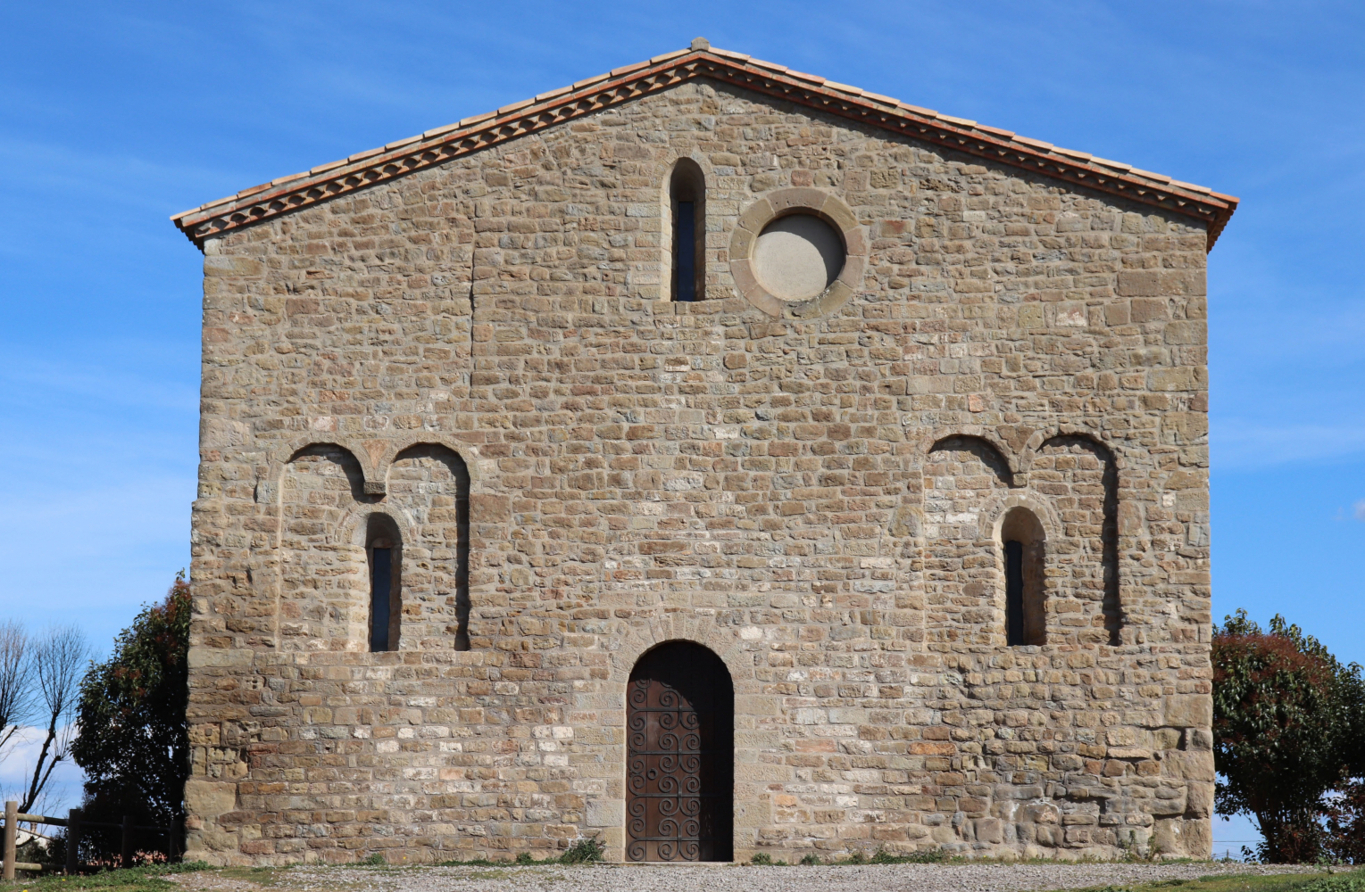 La planta basilical de tres naus és romànica del segle XI. Cal subratllar la decoració llombarda que tenen les finestres de la façana.