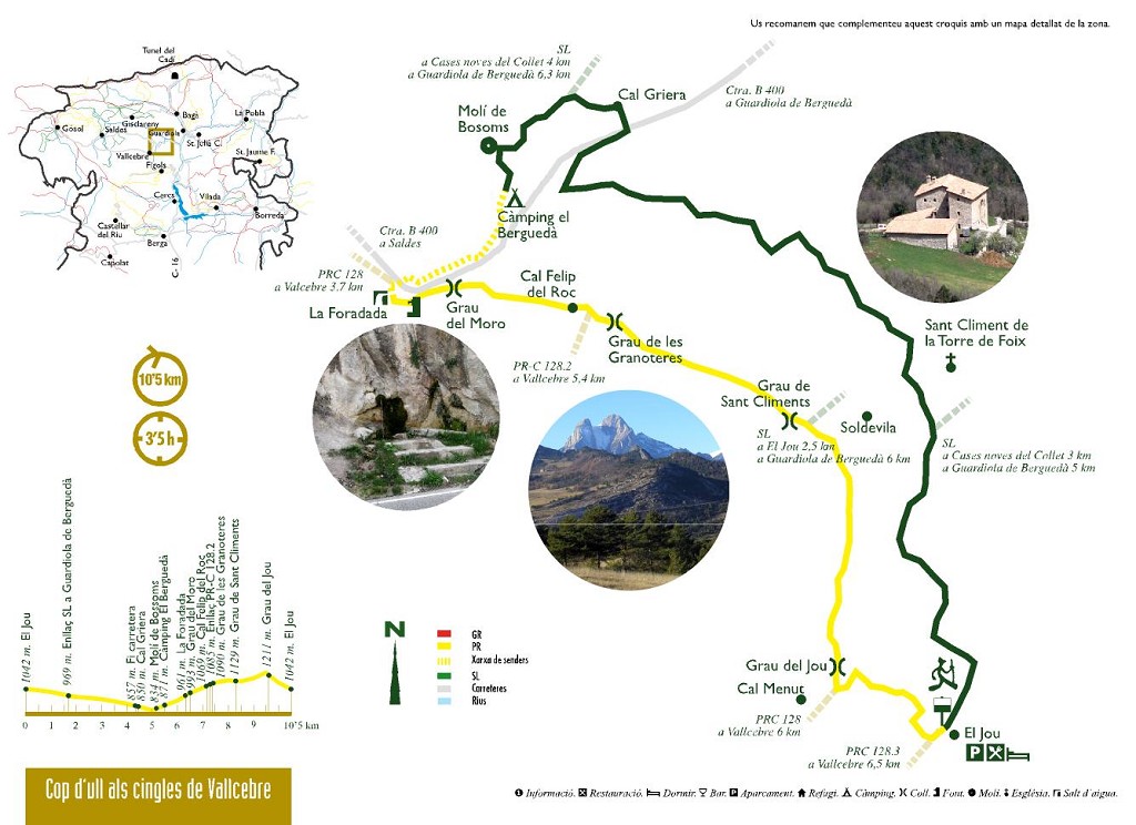 Take care when walking near the karstic fissures near Cal Menut. Some have been filled in with bits of pallet and other rubble but it’s a good idea not to get too close. People who don’t like heights might feel uncomfortable along some of the more exposed stretches, particularly between Cal Menut and the Grau de Sant Climent. Keep a watch out for cars along the roads, particularly the Saldes road, as it usually has a lot of traffic at weekends and during holiday periods.