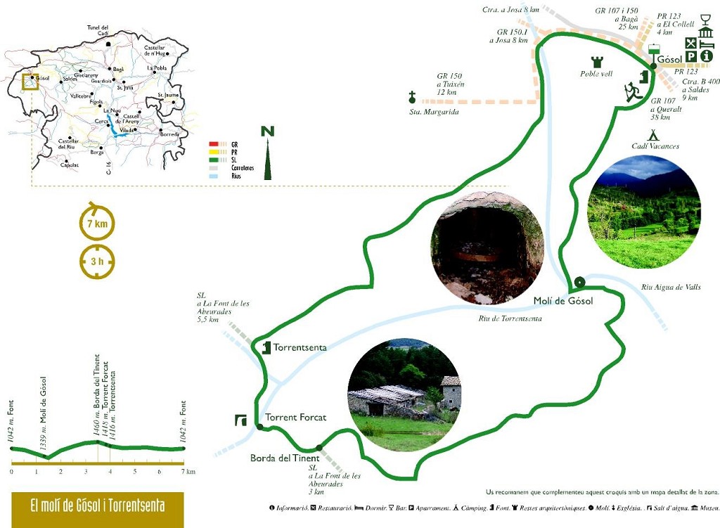 Start going down alongside the fields until you reach the Gósol mill. The building has been restored and there are no longer any old features in view, but if you go behind, you can still see two water spouts with the remains of some machinery; there is also a pipe leading to a nearby building where there was a turbine to produce electricity for the town. It is clear that here a double use was made of the water. In front of the mill there is a trout fish farm and beside the river, a picnic area set up for the fishermen.