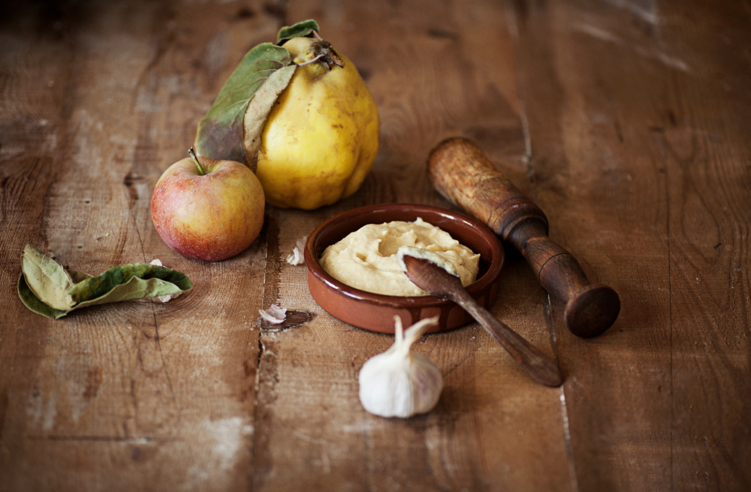 Put the garlic in a mortar and mash it until it is like a paste and add the apple and quinces, stirring constantly until everything is integrated.