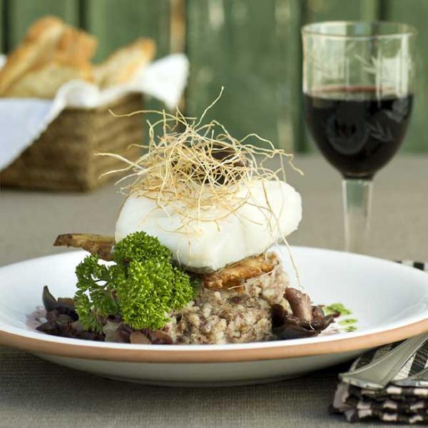 To assemble the dish, start with a layer of mashed potatoes, then add a slice of bacon, followed by the cod fillet on top. Add the sautéed mushrooms and drizzle with the ratafia reduction left in the pan after cooking the mushrooms.
