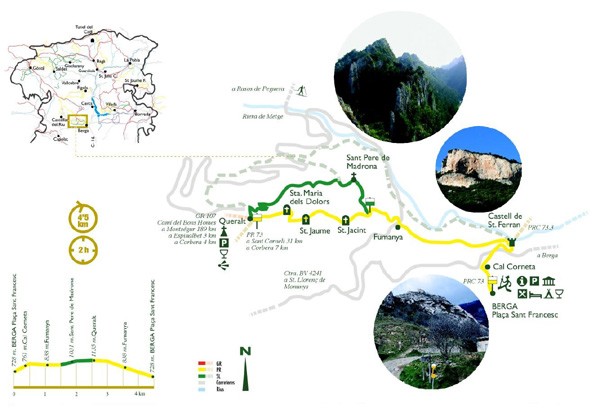 • Señalización: Marques grogues i blanques (PR C-73) fins passada la carretera de Queralt, ja entrats a la drecera de Queralt; marques grogues fins a Queralt i marques grogues i blanques (PR C-73) fins a Berga.
