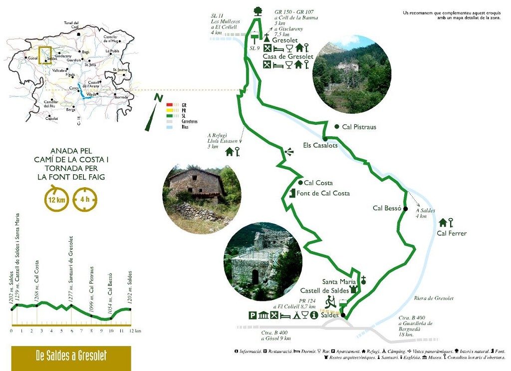 Saldes tiene dos atractivos de primer orden: el Pedraforca y Gresolet. Esta ruta os permitirá ver diferentes perspectivas de ambos. La ida se hace por el camino de la Costa, el antiguo camino que unía Gresolet y Saldes, de gran belleza. La vuelta baja por la carretera de Gresolet hasta Cal Bessó.