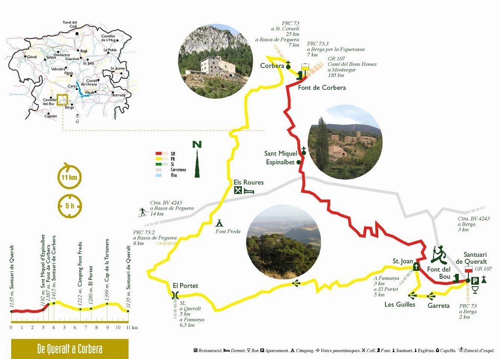 Señalización: Marques vermelles i blanques (GR 107) de Queralt a Corbera; marques grogues i blanques de Corbera a Queralt (PRC-73).