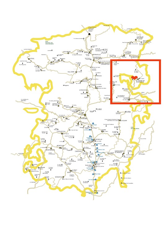 Fijaos, comparando las dos imágenes, cómo el paisaje de los alrededores de Sant Jaume de Frontanyà es más boscoso. La principal causa de esto es la reducción de la presión ganadera, agrícola y de los aprovechamientos forestales sobre el paisaje.