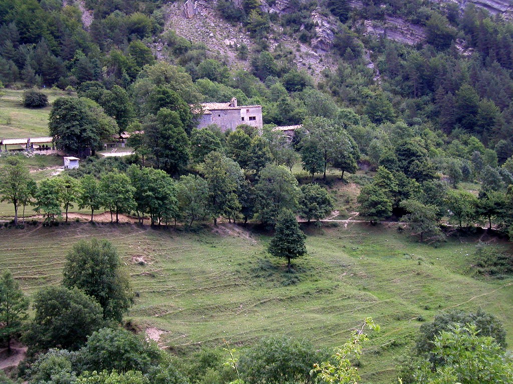 Ce chemin vous conduira jusqu'au sanctuaire de Gresolet, l'un des endroits les plus emblématiques de la région. Surélevé par rapport à la vallée, il a devant lui la grande forêt de Gresolet où se trouve la plus grande pinède du Berguedà. Elle a pour limite supérieure la couronne calcaire qui forme le versant nord du Pedraforca. Cet endroit est recensé depuis le XIIIème siècle. Il ne reste plus rien de la structure romane originale de l'église à cause des rénovations périodiques qui y ont été réalisées.